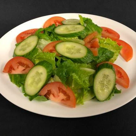 Lettuce, tomato, and cucumber with homemade dressing sauce.