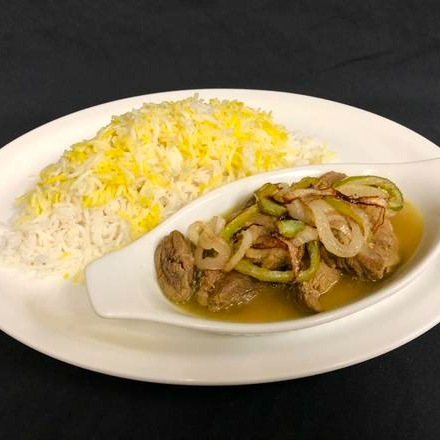 A stew cooked with dried herbs and lamb served with saffron rice.