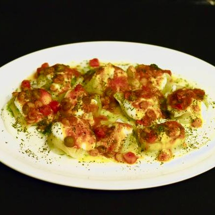 Ground beef, onions, and spices are wrapped in a thin dough and steamed topped with dollops of homemade yogurt and a bit of vegetable sauce, and this dish is very flavourful.