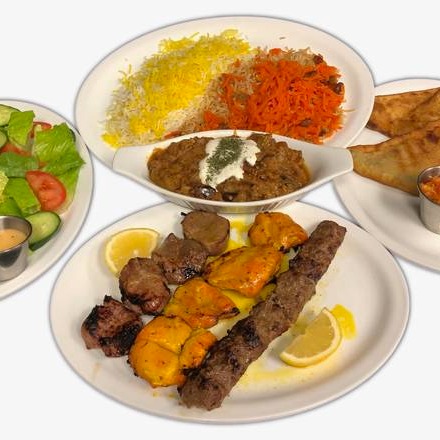 2 Skewers of Beef Shamie, Chicken and Lamb kabab (BBQs), Kabuli rice, saffron rice, side dish and appetizer like samosa and season salad included homemade garlic sauce.