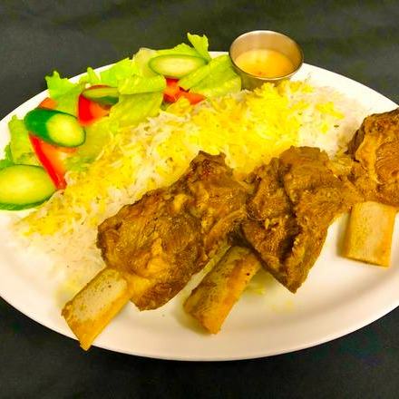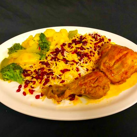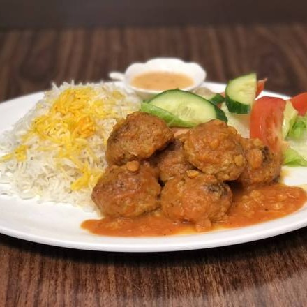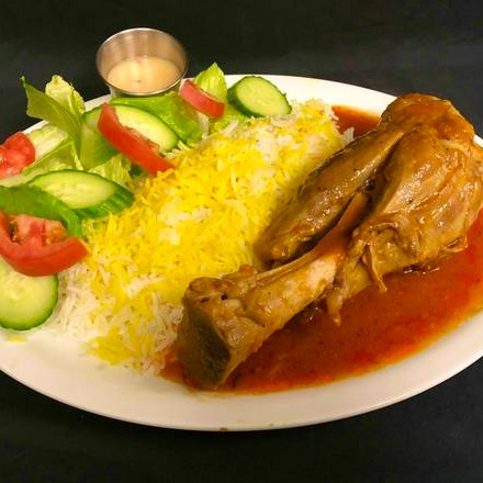 Served with saffron rice, zereshk (barberry), and vegetables, or salad.