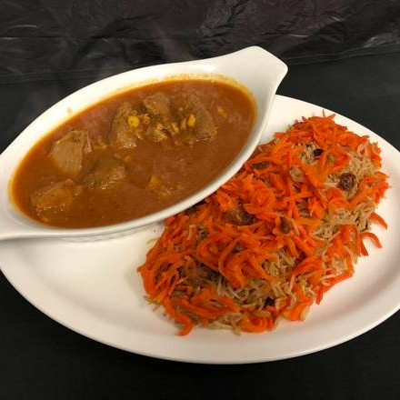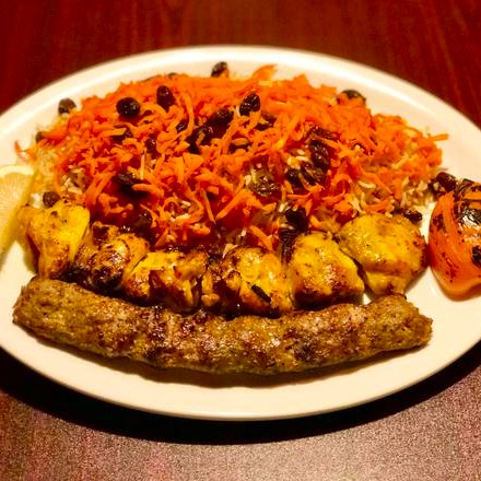 Can't decide whether to have chicken or beef have them both serving with with delicious Afghan traditional Qhabuli rice topped shredded carrots and raisins.
