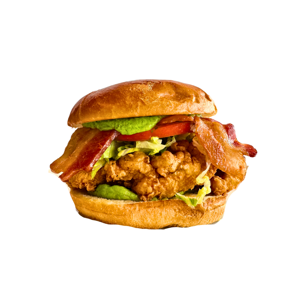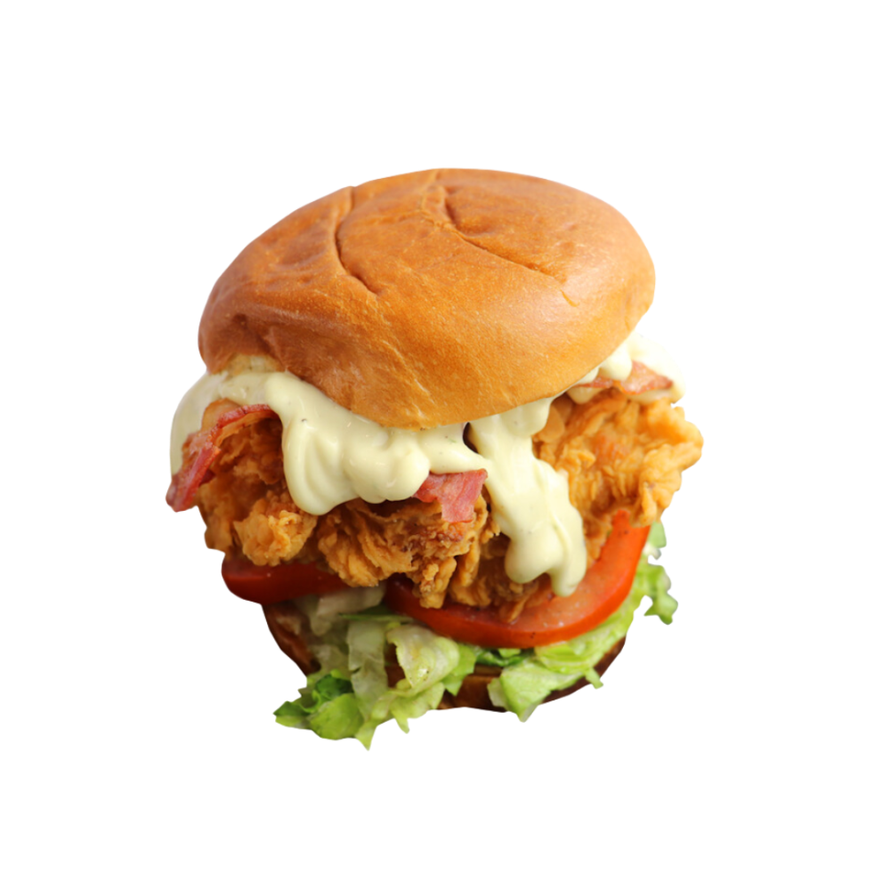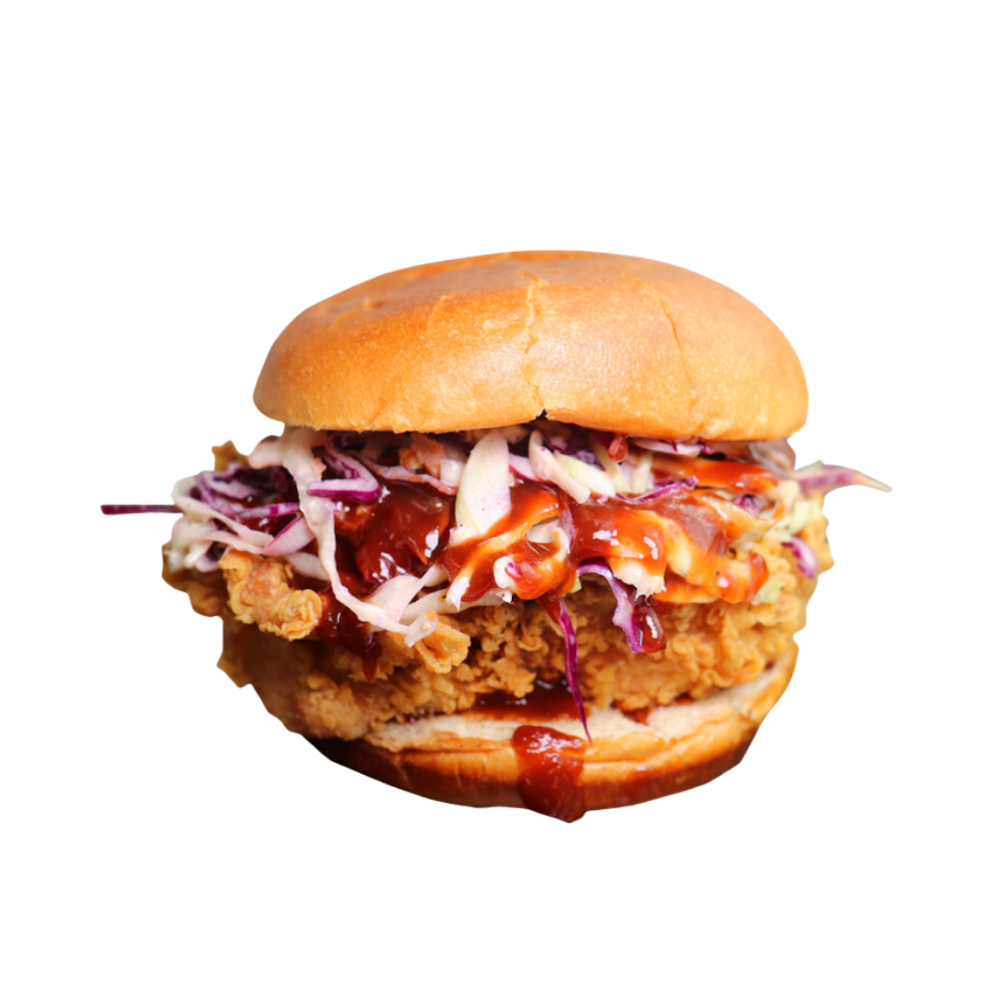 Breaded Beef Burger, Romaine lettuce, Beaks sauce and red onion.