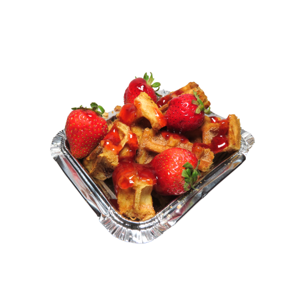 Strawberry Infused Waffle Bites, cinnamon sugar and strawberry sauce.