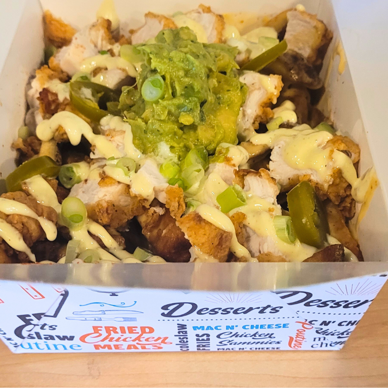 Fries, Mac Sauce, Guac, Ranch, Green Onion, Jalapeno, Crispy Chicken