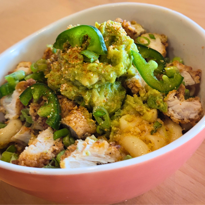 Mac & cheese, Green Onion, Guac, Ranch, Jalapeno, Crispy Chicken