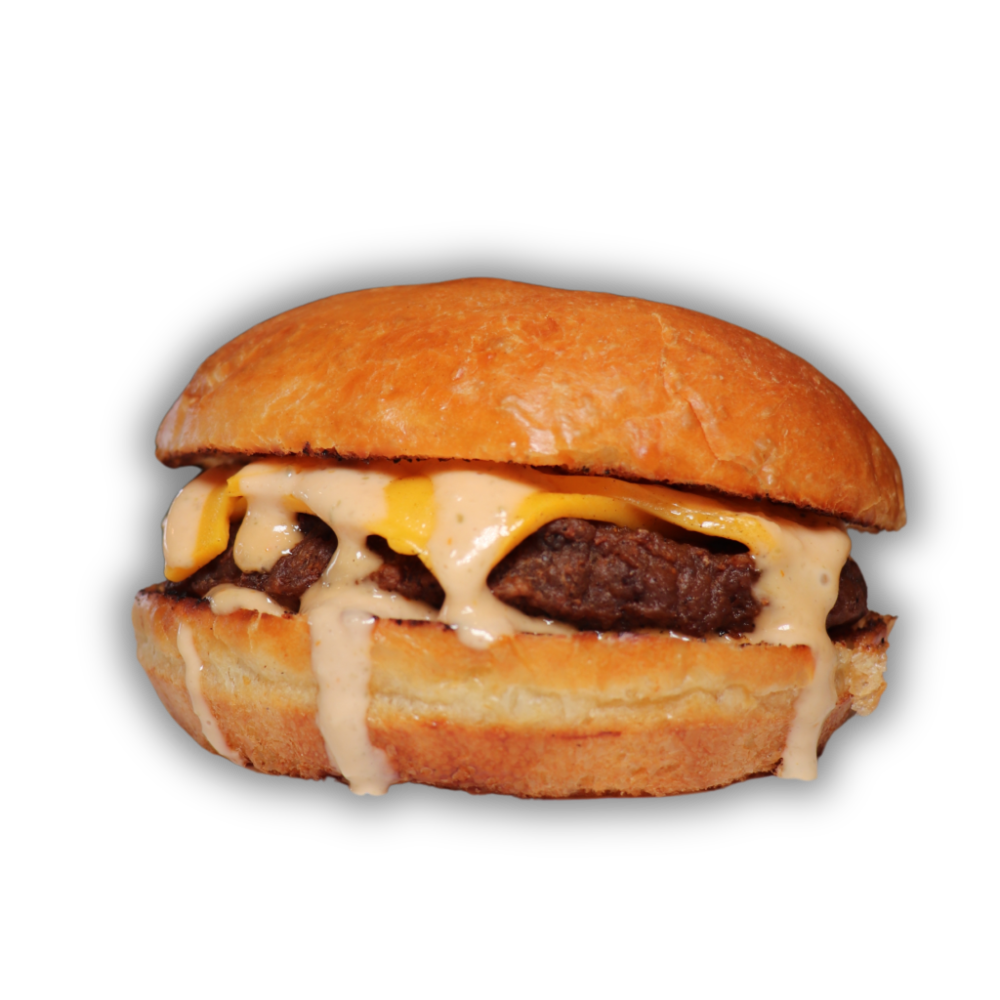 Single Beef Burger, Beaks Sauce, Red onion, Sliced Pickles and cheddar cheese.