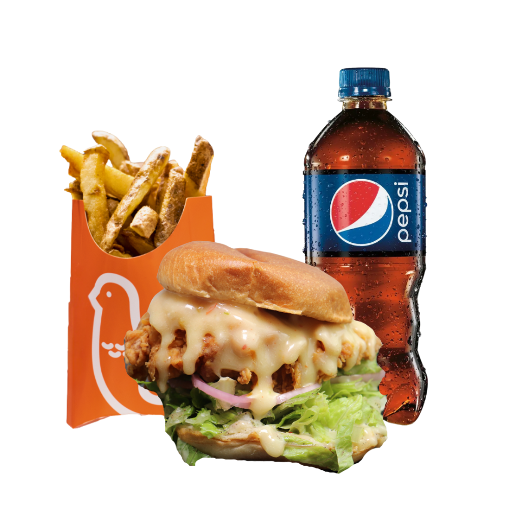 Breaded Beef Burger, Romaine lettuce, Beaks sauce and red onion, small fries. 591ml drink.