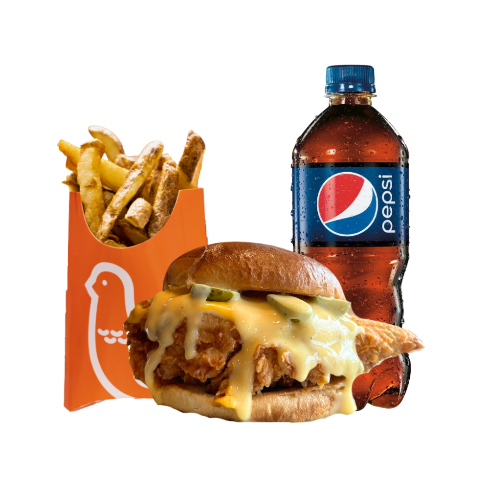 Honey habanero-mayo, cheddar, pickled red onions, lettuce, small fries, 591ml drink.