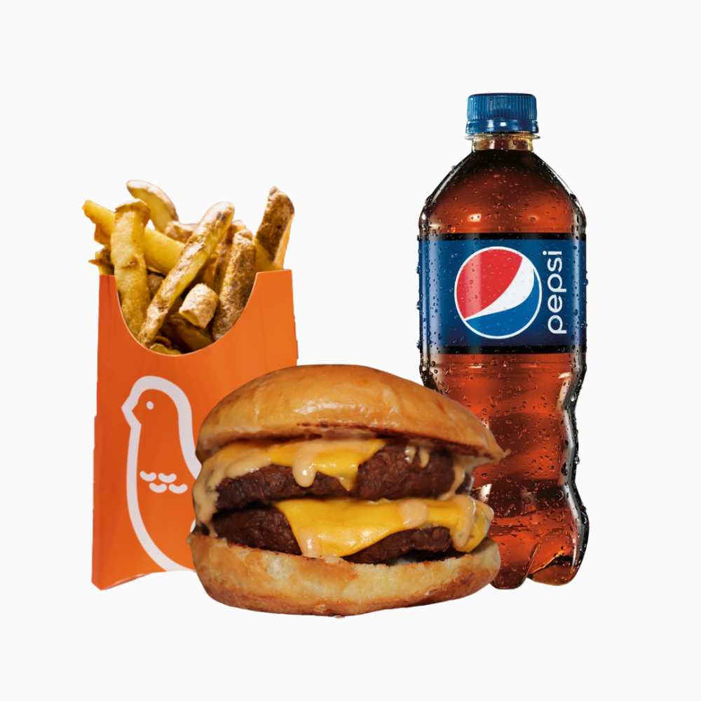 Two Beef Burger, Beaks Sauce, Red onion, Sliced Pickles and cheddar cheese,small fries, 591ml drink.