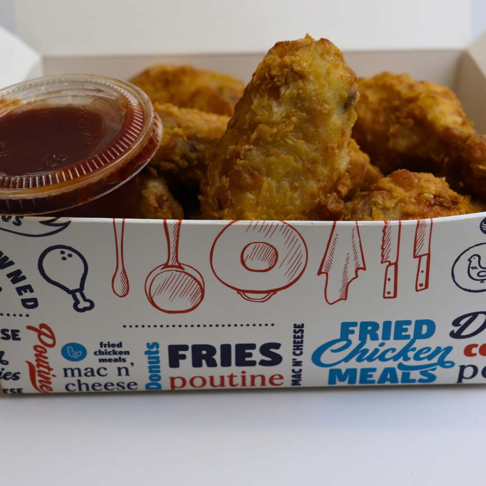 2 Drums, 1 Thigh, 4 Strips, 3 Small Sides, Pickles and 2 Dips.
