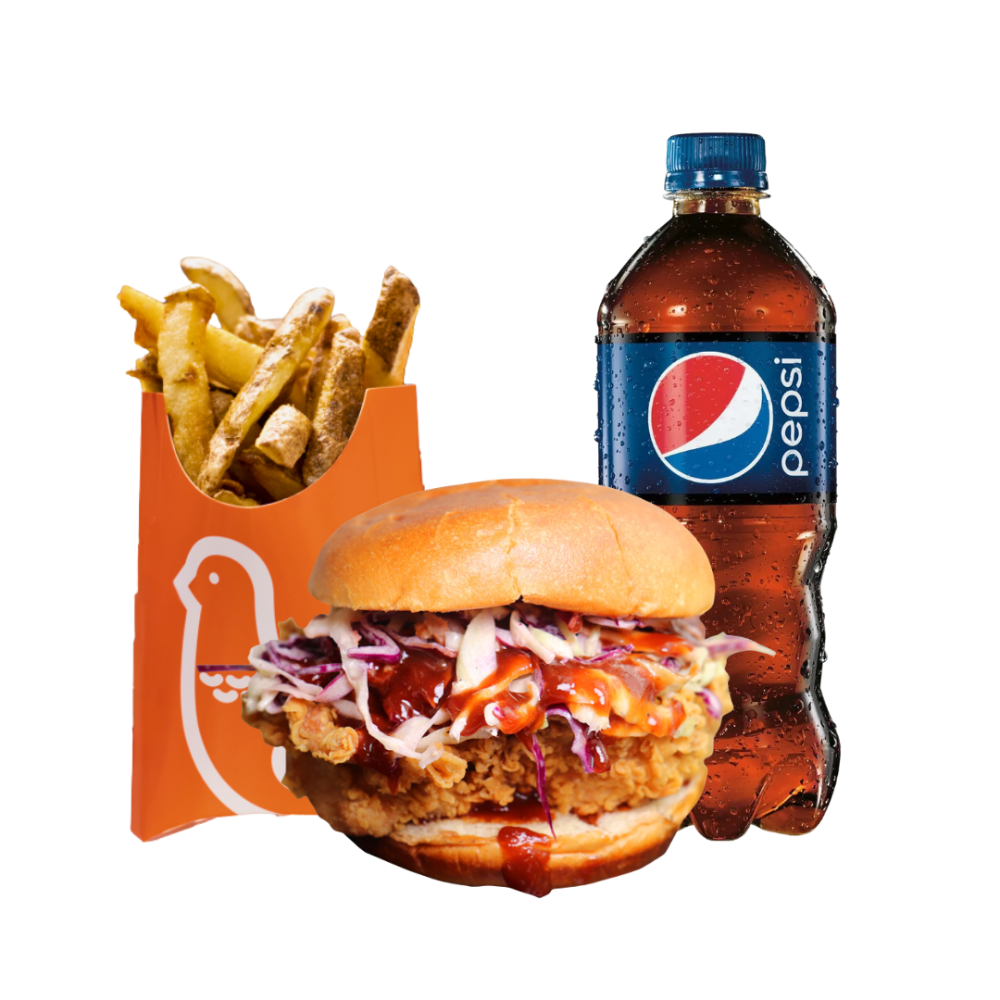 Spicy BBQ sauce, Coleslaw, small fries, 591ml drink.