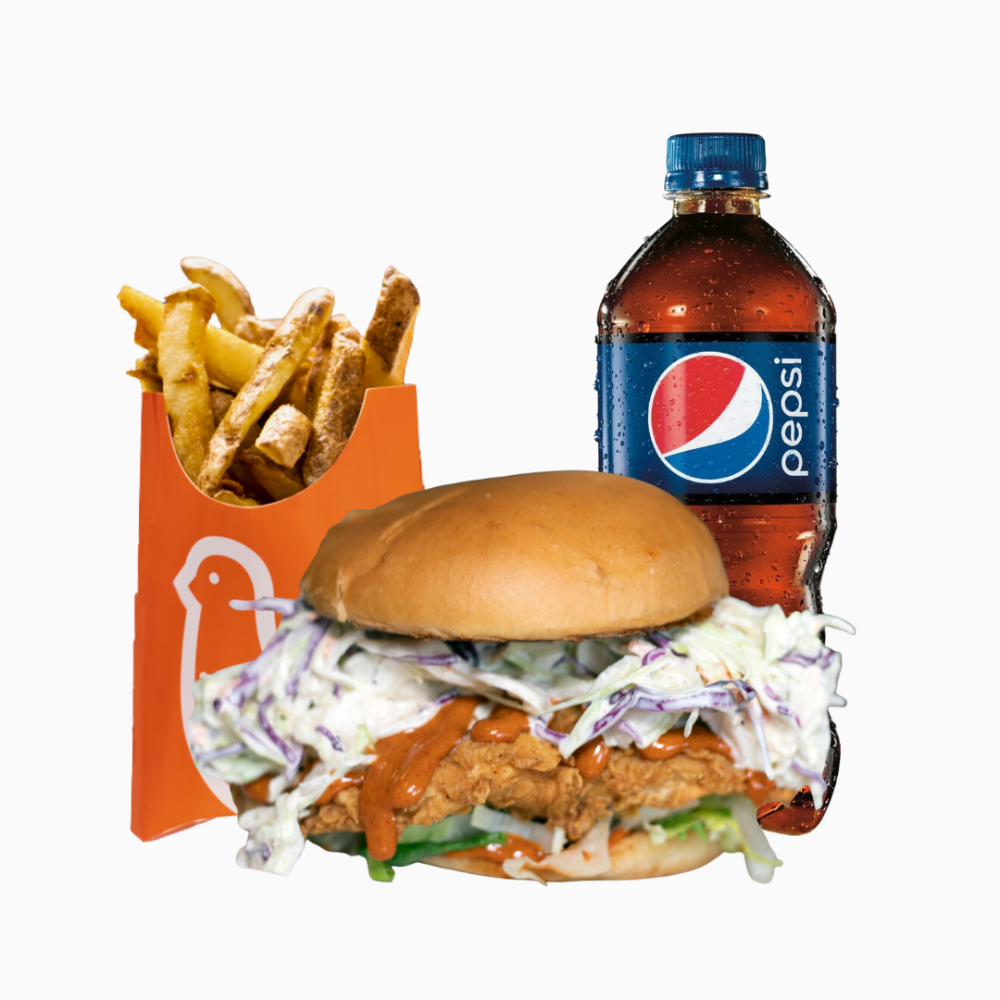 Hot Honey, Lettuce, Coleslaw, Pickles, small fries, 591ml drink.