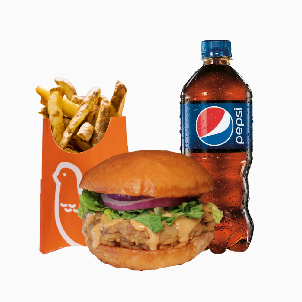 Breaded Beef Burger, Romaine lettuce, Beaks sauce and red onion, small fries. 591ml drink.