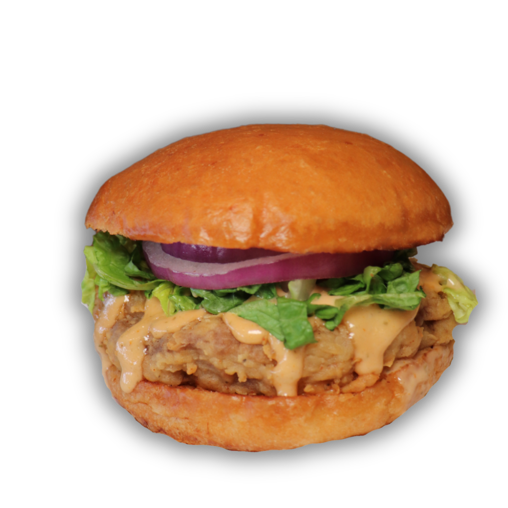 Breaded Beef Burger, Romaine lettuce, Beaks sauce and red onion.
