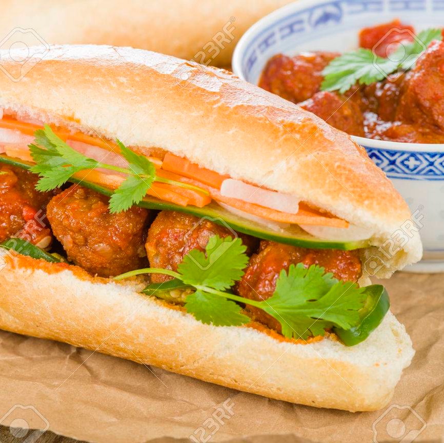 Mayo and homemade meatballs in tomato sauce and veggies. All subs come with green onion, house special sauce, and veggies such as cucumber, cilantro, jalapeno, and homemade pickled carrot. Our baguette is made fresh daily at our main bakery. Our homemade mayonnaise contains a mixture of egg yolks, olive oil, and crushed garlic.