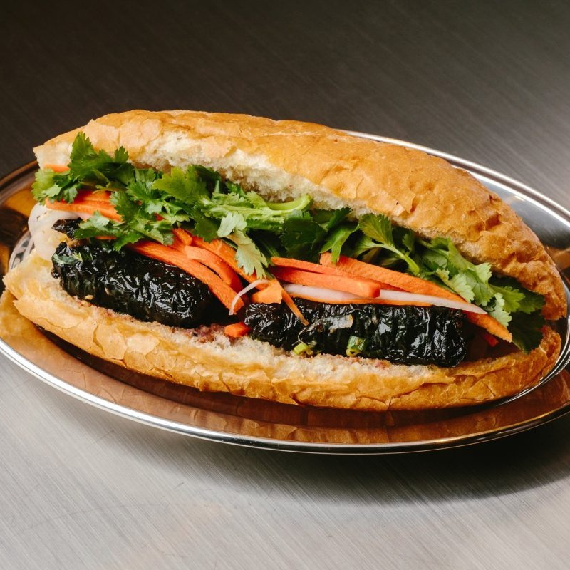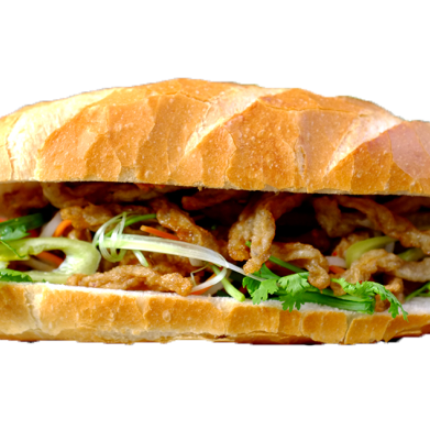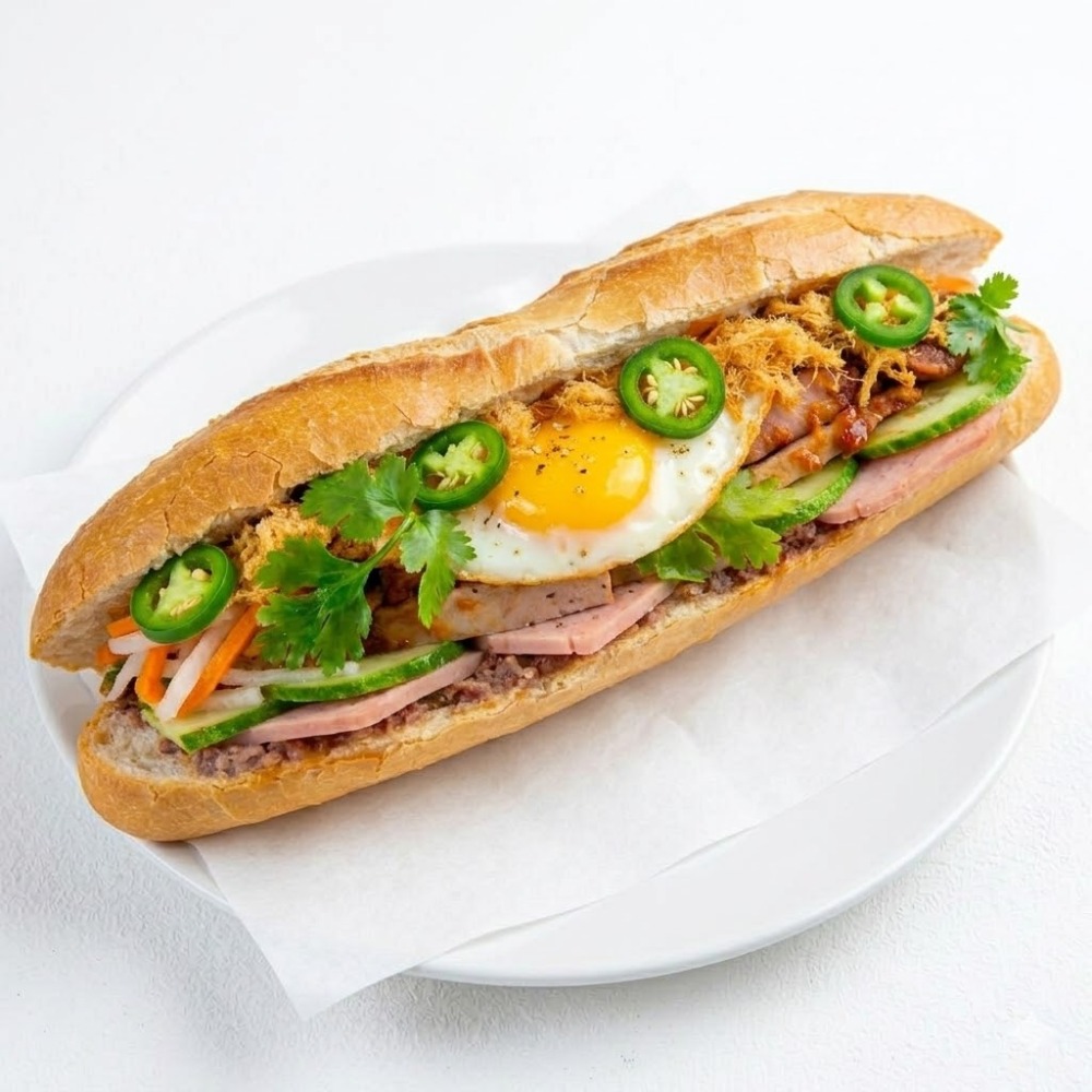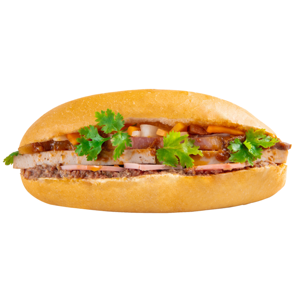 Pate, mayo, headcheese, pork ham, shredded dried pork, roasted side pork, soft running egg. All subs come with green onion, house special sauce, and veggies such as cucumber, cilantro, jalapeno, and homemade pickled carrot. Our baguette is made fresh daily at our main bakery. Our pate consists of grounded pork, chicken liver, and spices. Our homemade mayonnaise contains a mixture of egg yolks, oli