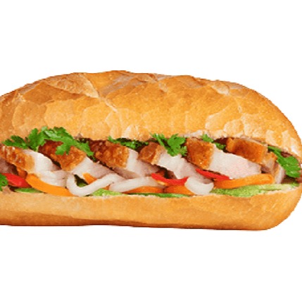 Pate, mayo, headcheese, pork ham, roasted side pork. All subs come with green onion, house special sauce, and veggies such as cucumber, cilantro, jalapeno, and homemade pickled carrot. Our baguette is made fresh daily at our main bakery. Our pate consists of grounded pork, chicken liver, and spices. Our homemade mayonnaise contains a mixture of egg yolks, oli