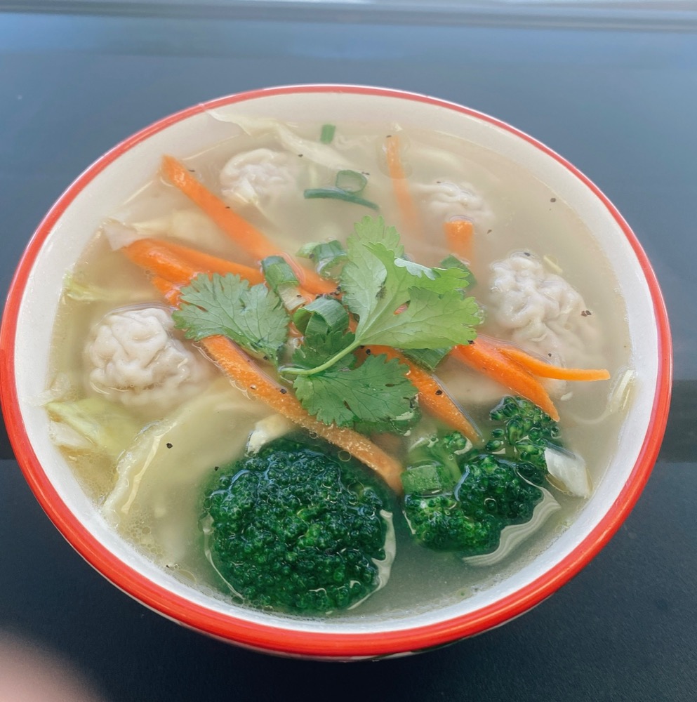 6 pieces of pork wonton, broccoli, carrots, cabbage in chicken & pork broth, garnished with chopped green onion and cilantro.