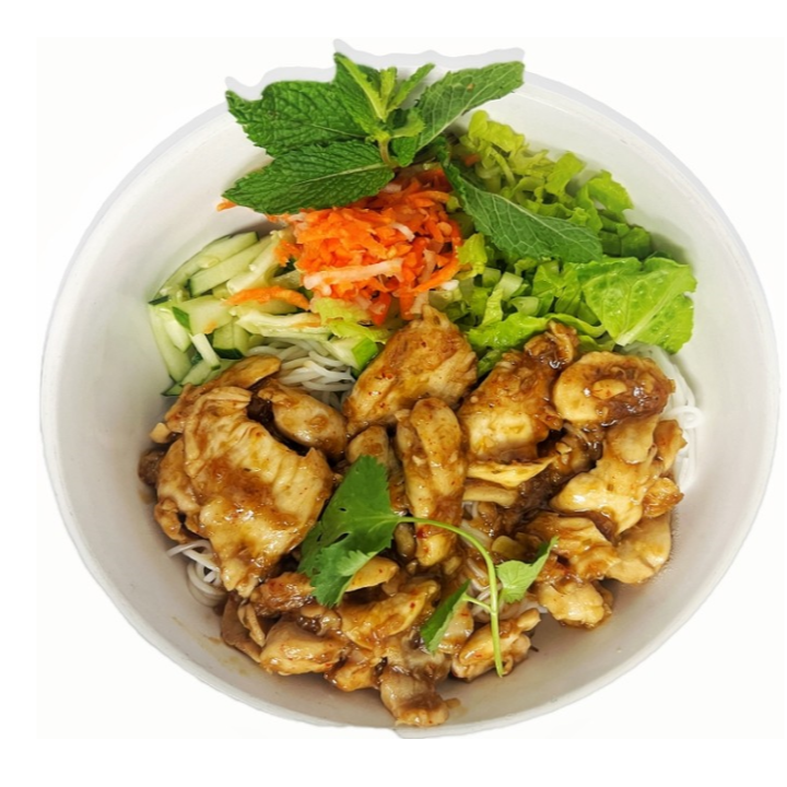 Rice vermicelli served in a bowl with lettuce, cucumber, carrot, mint, green onion, and lemongrass chicken. Recommend add on spring roll and /or crispy wonton