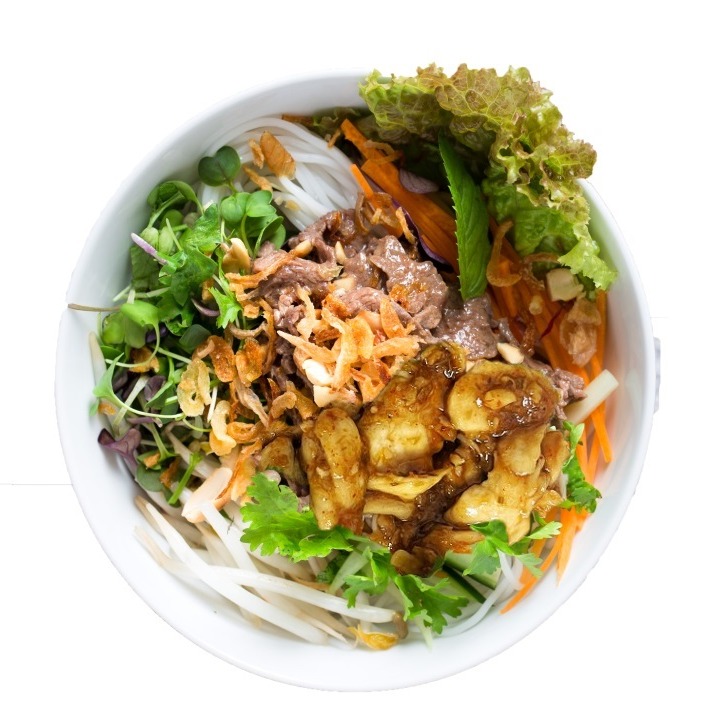 Rice vermicelli served in a bowl with lettuce, cucumber, carrot, mint, green onion, lemongrass chicken, and sauteed beef. Recommend adds on spring roll/crispy wonton