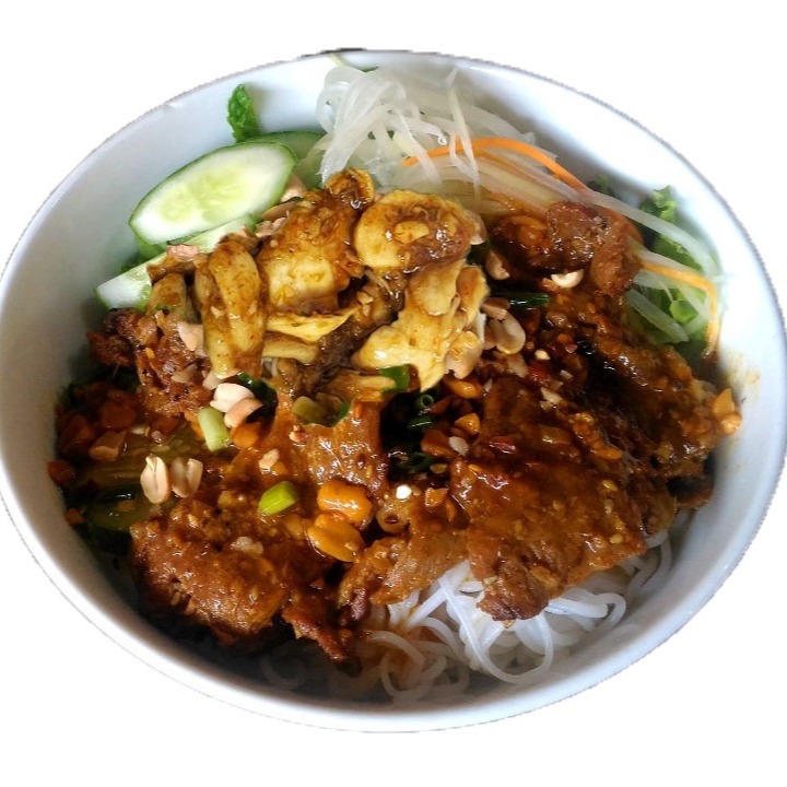 Rice vermicelli served in a bowl with lettuce, cucumber, carrot, green onion, and sate beef. Recommend adds on spring roll and or crispy wonton
