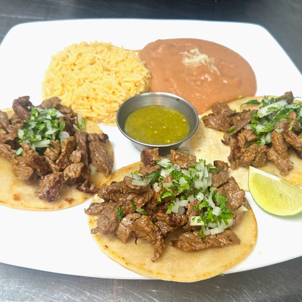 3 Birria, cheese, onion and cilantro. Served with rice, beans, green salsa and consome.