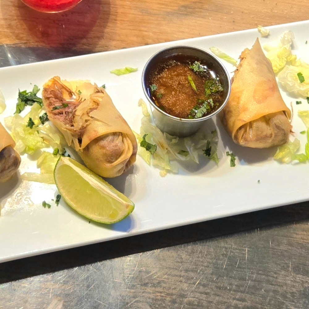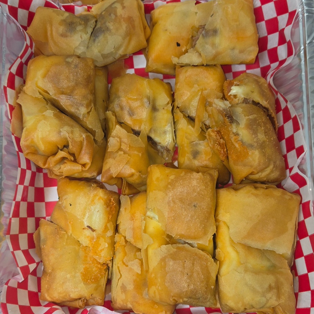 4 rolls , braised beef, with Oaxaca cheese served with consome and green salsa.