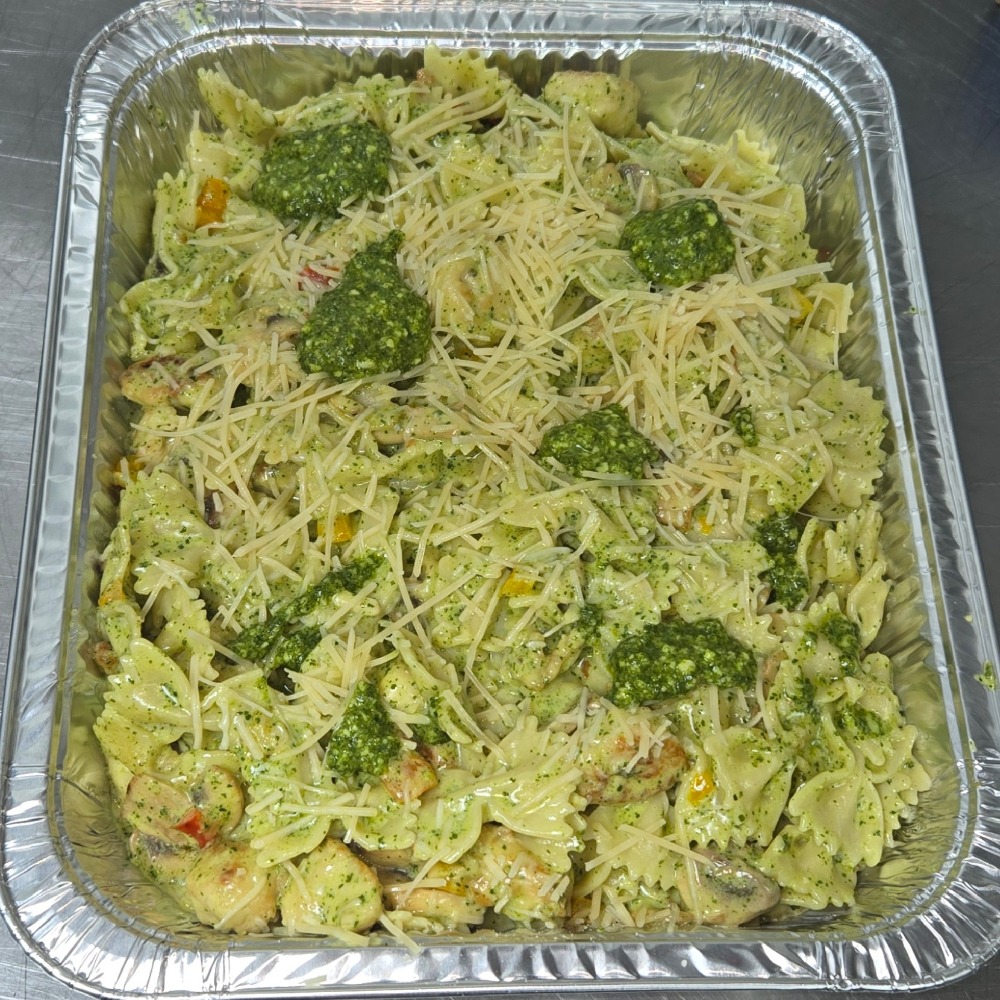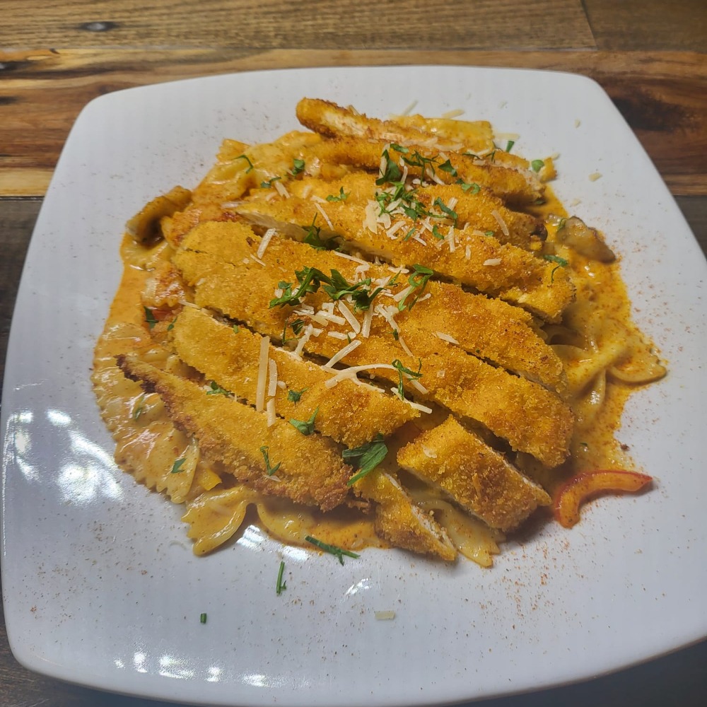 Breaded Chicken, bowtie pasta, bell peppers,mushrooms, onions, creamy cajun sauce.