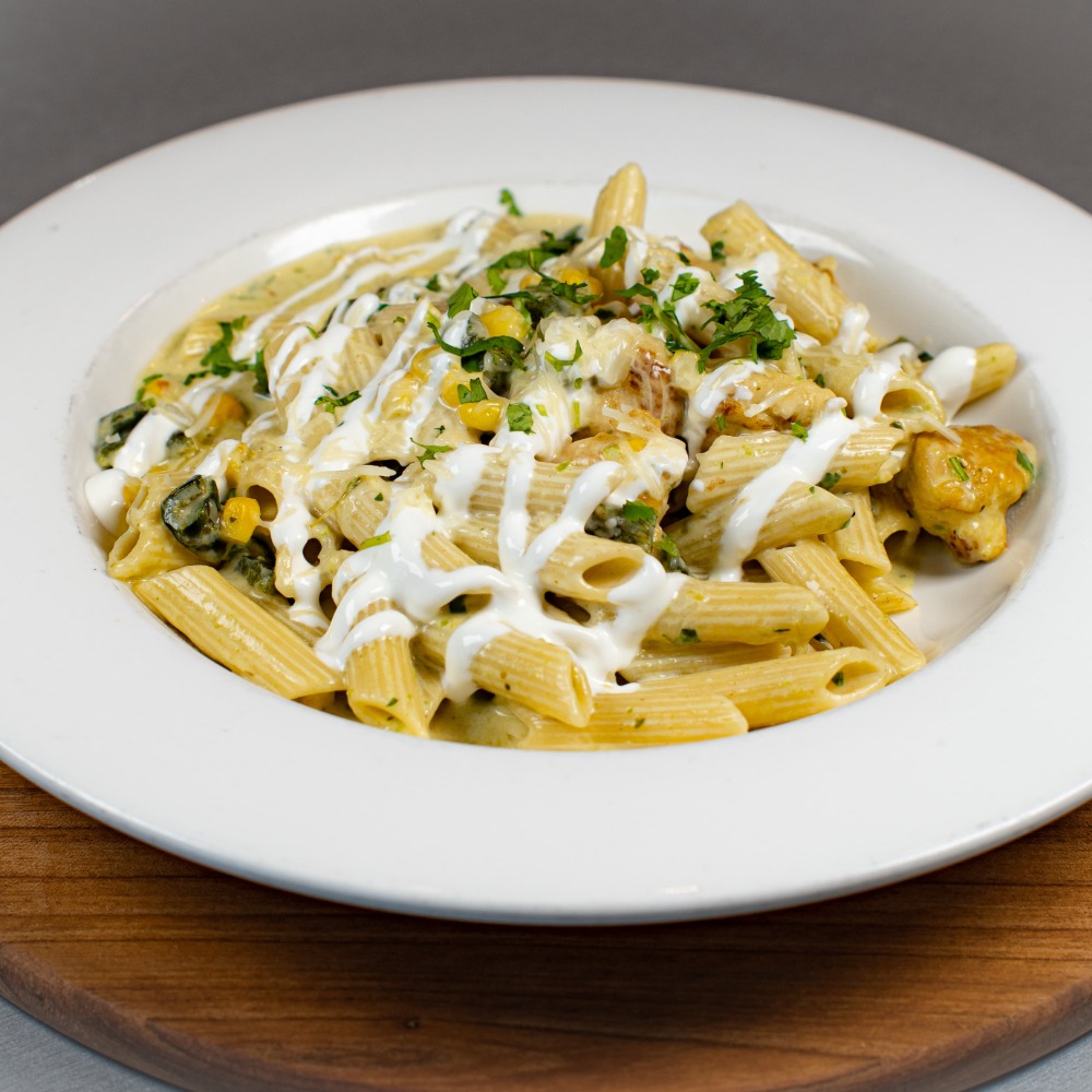 Penne pasta, corn, poblano pepper, cheese, cilantro and sour cream