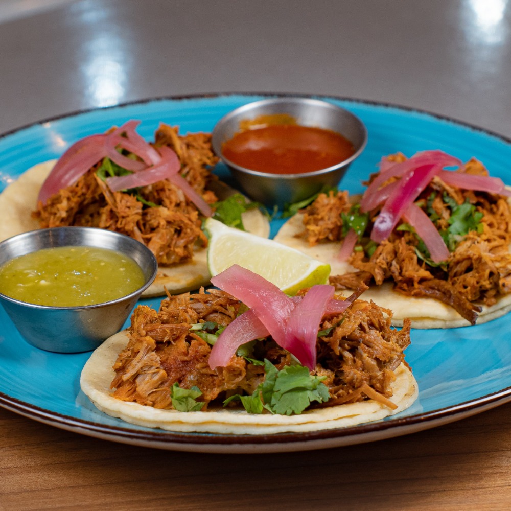 Marinated shredded pork, pickled red onion and cilantro. Served with rice.