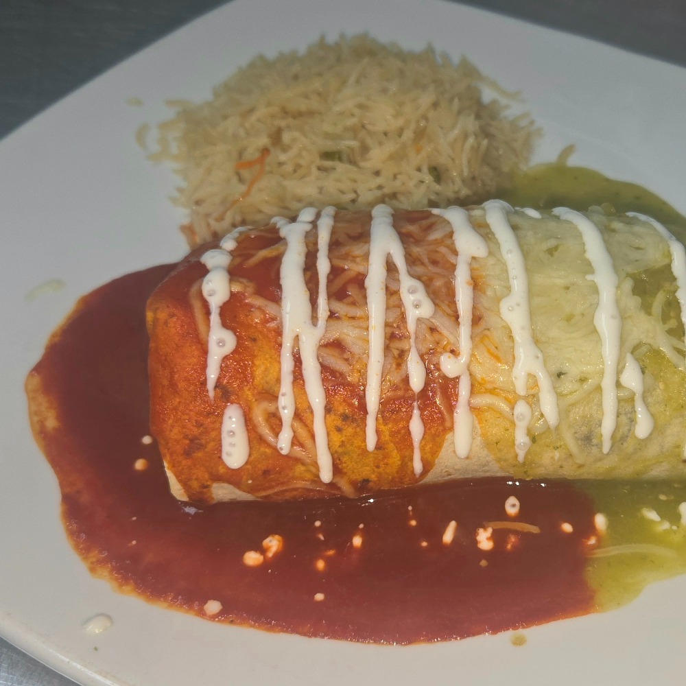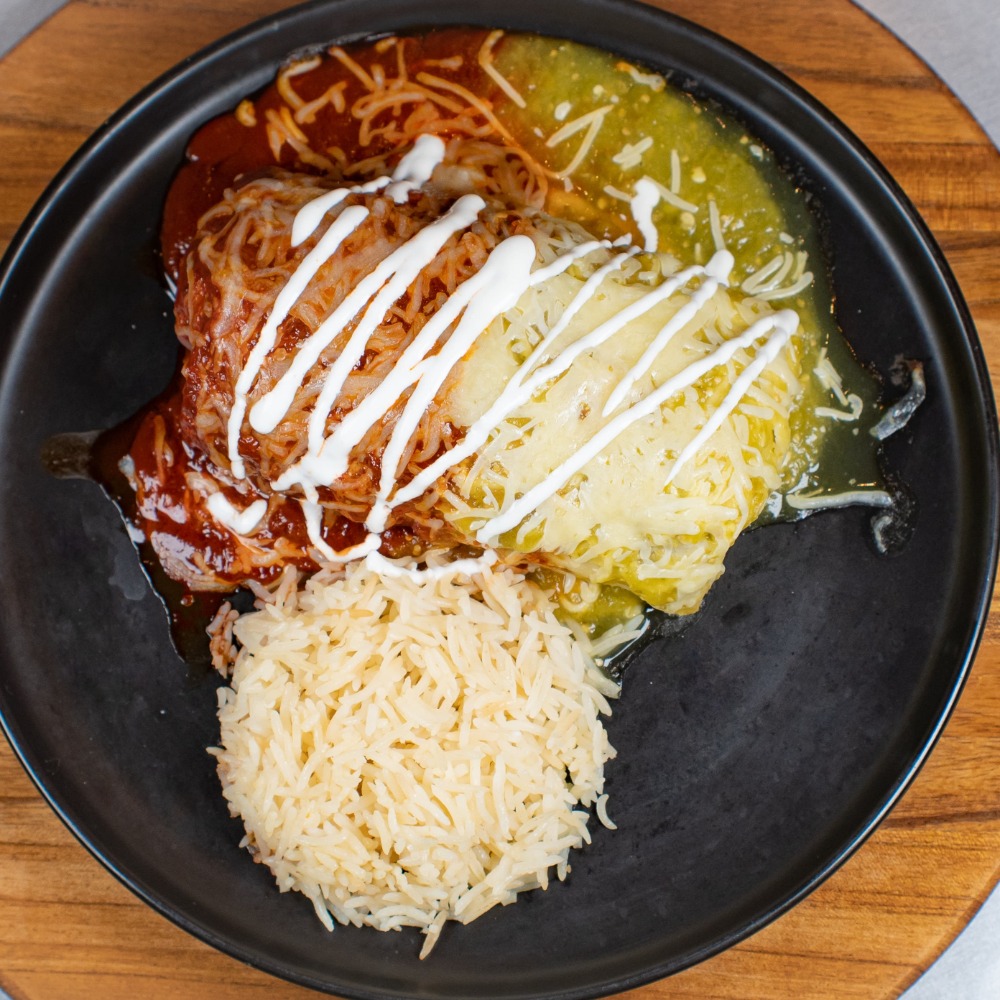 Beans, lettuce, tomato, cheese and sour cream. Served with rice. Green and red sauce on top