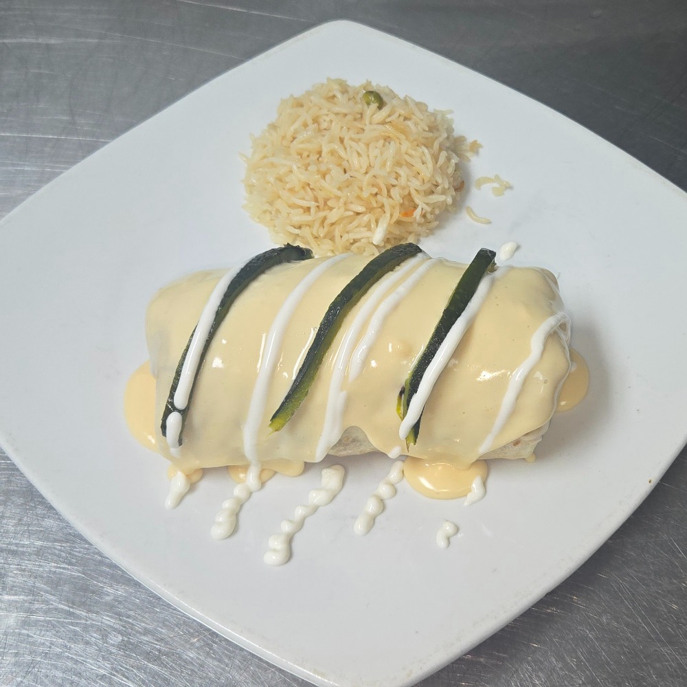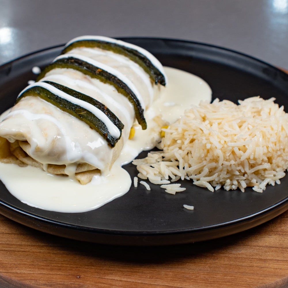 Beans, lettuce, tomato, cheese and sour cream. Served with rice. Poblano rajas in cheese sauce on top