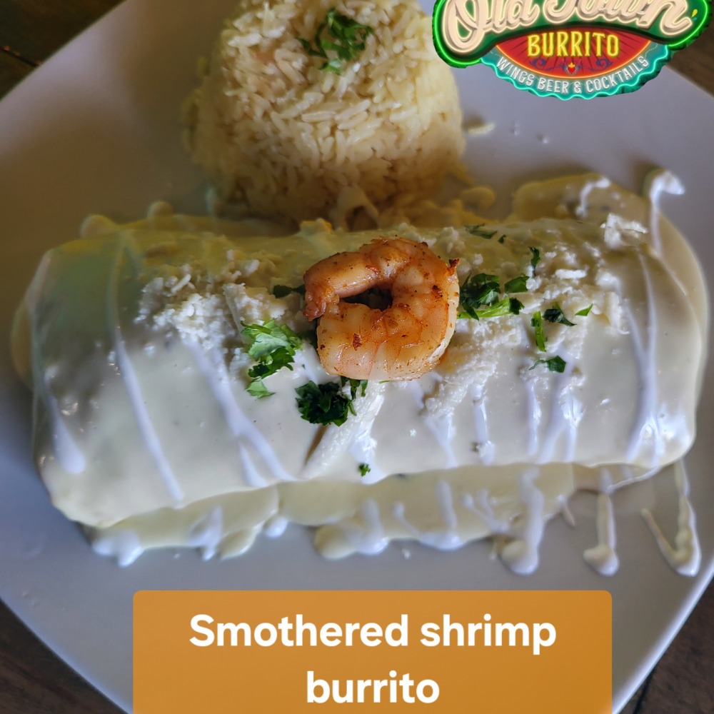 Beans, lettuce, tomato, cheese and sour cream. served with rice. Whithe cheese sauce on top