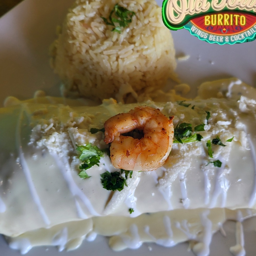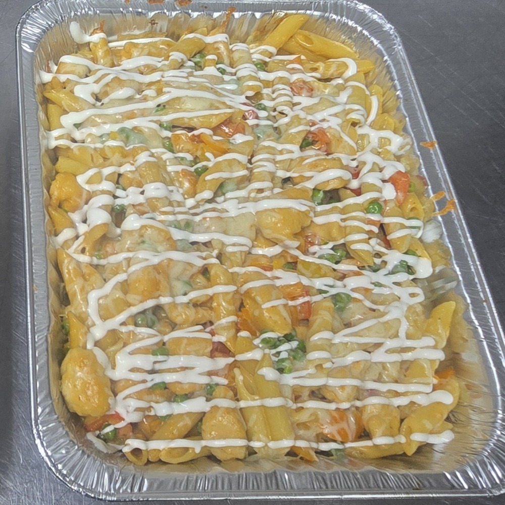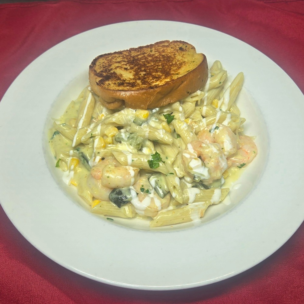 Penne pasta, Shrimp, garlic, peas, bell peppers, cream chipotle sauce, sour cream and crumbled cheese.