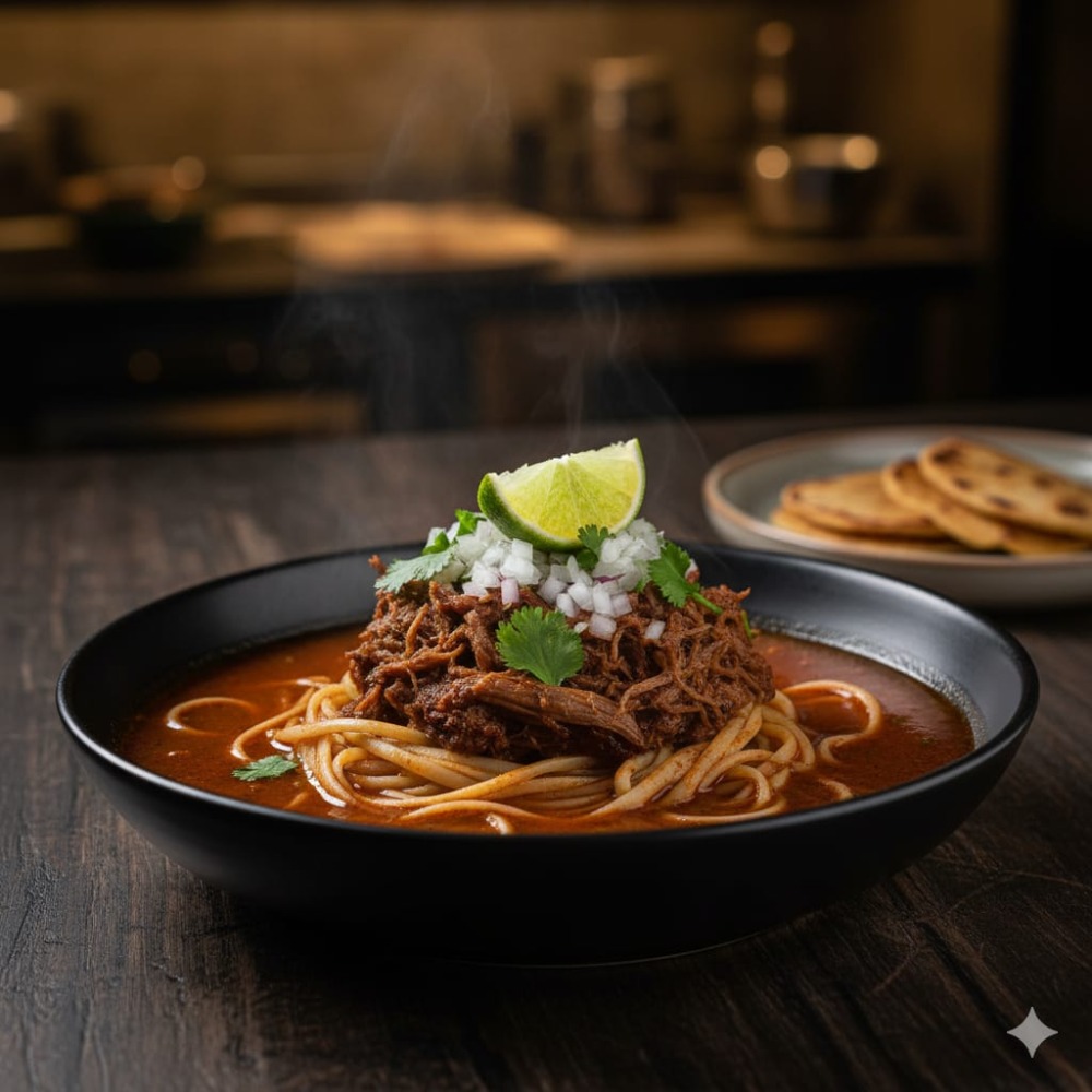 Consome, Birria,Linguine, cilantro, onions, lime, green sauce.