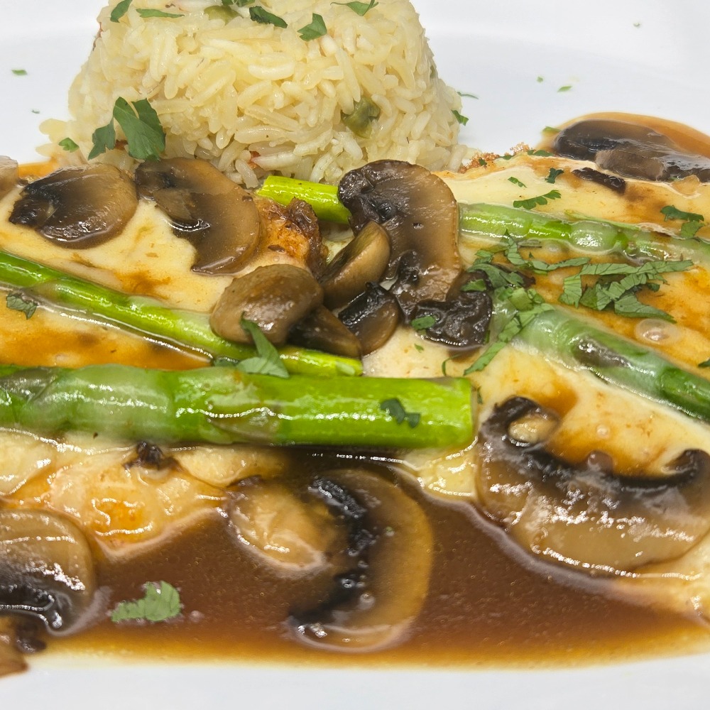 Fish served with rice, bell peppers, asparagus and special house sauce.