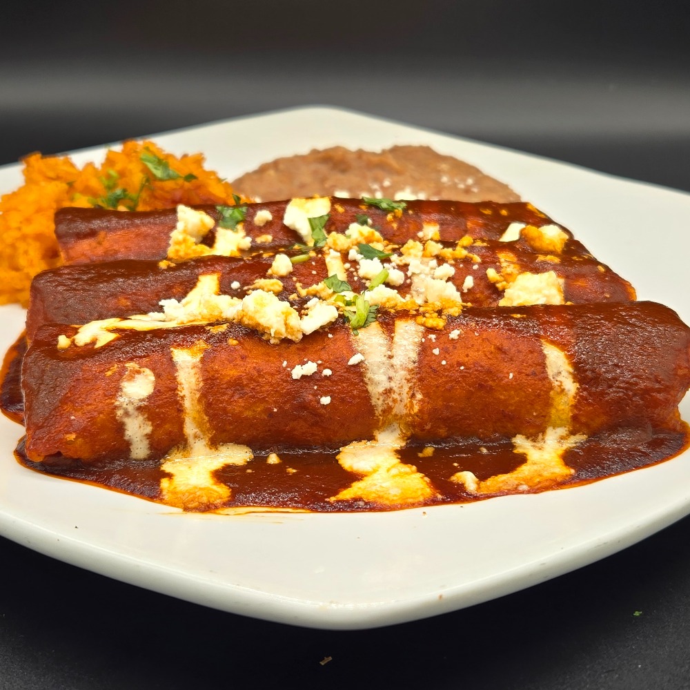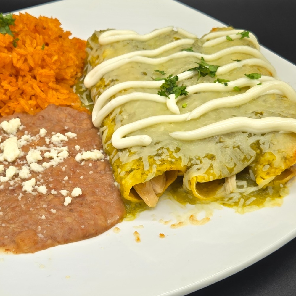 3 Enchiladas serve with beans and rice. Sour cream on top