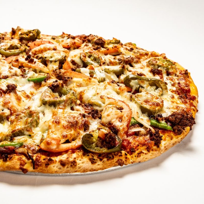 Seasoned beef, tomatoes, onions, green peppers, and jalapeno peppers.
