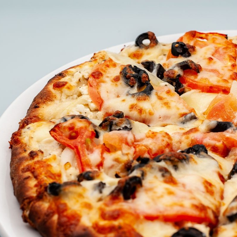 Made with Santa Lucia Pizza's traditional Greek sauce! Feta cheese, black olives, tomatoes, onions, and mozzarella cheese.