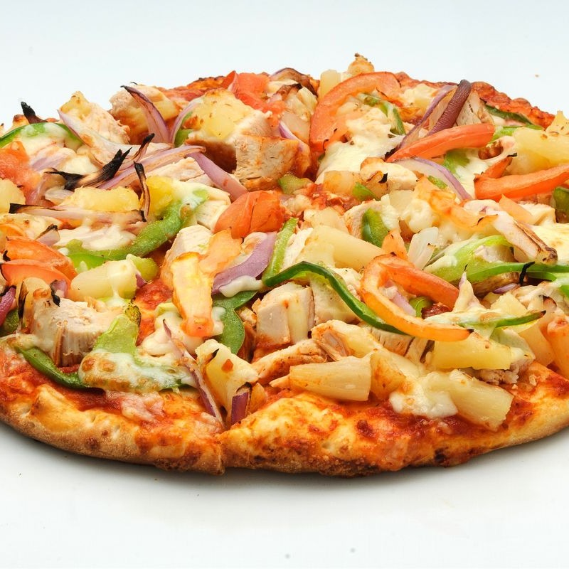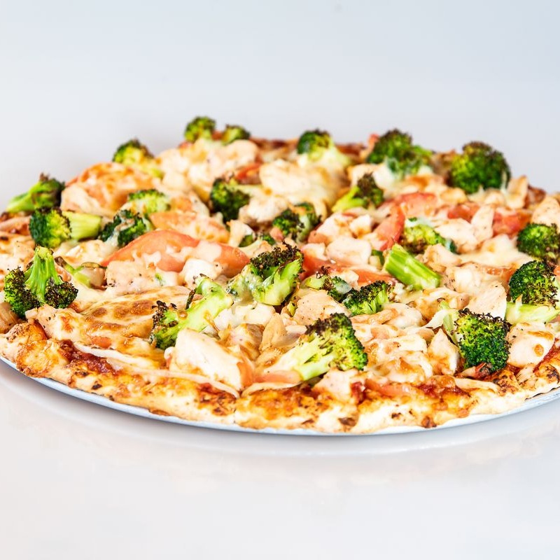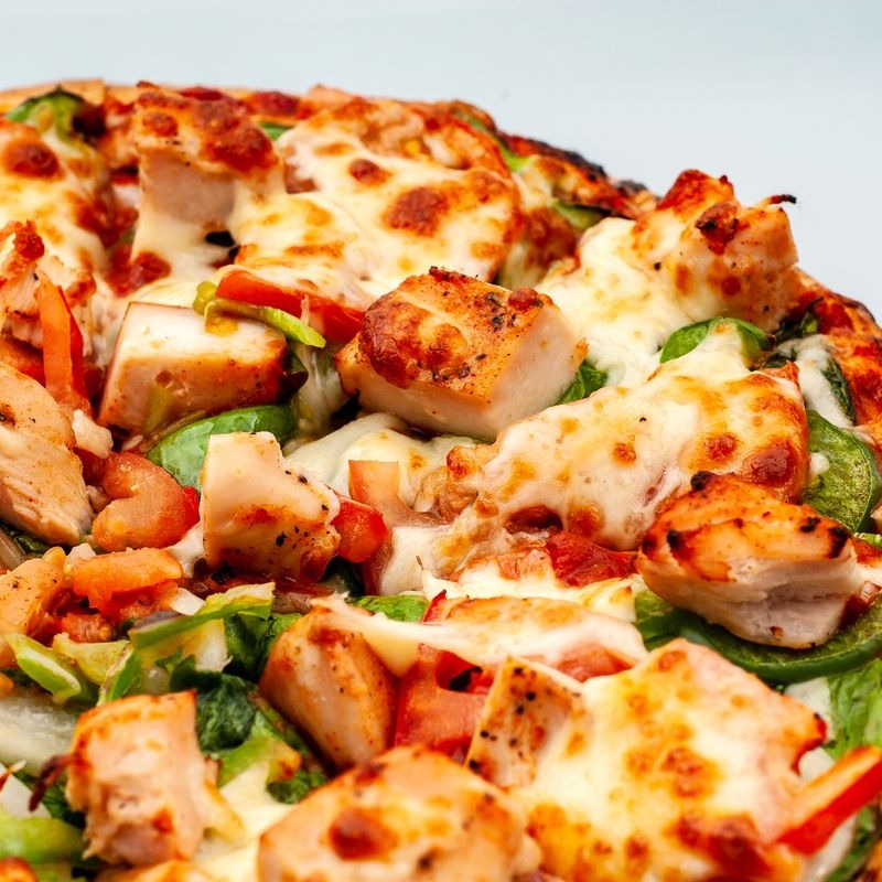On whole wheat crust! Seasoned chicken breast, green peppers, onions, tomatoes, spinach, and easy on the cheese.