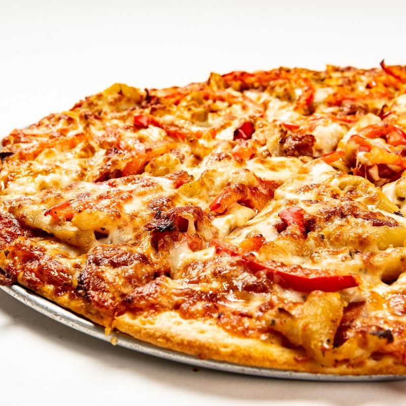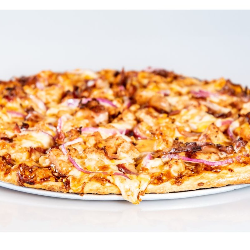 Barbeque sauce, seasoned chicken breast, side bacon, red onions, and cheddar cheese.
