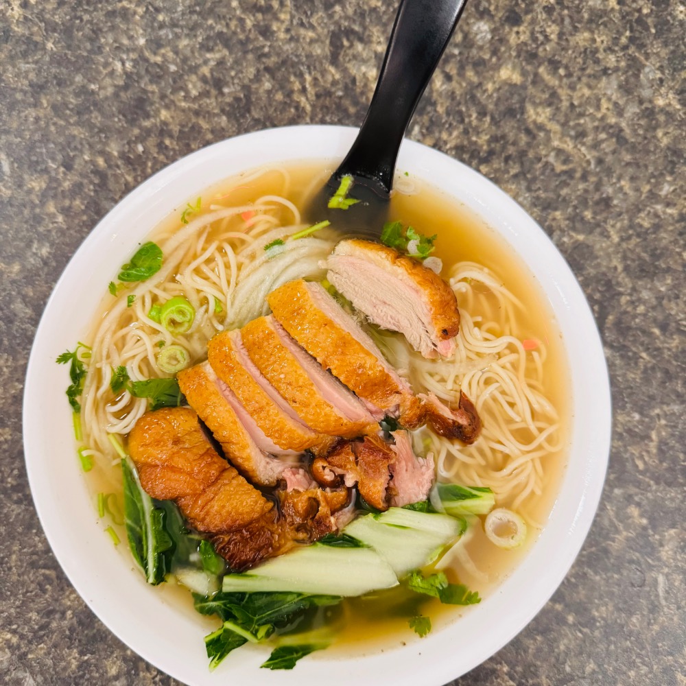 Onion,cilantro , bok choy,bbq duck,egg noodle soup