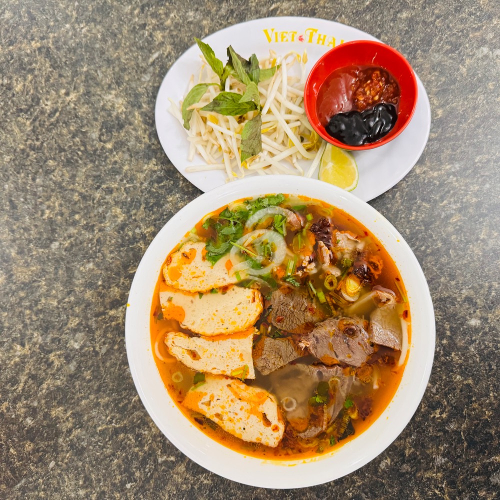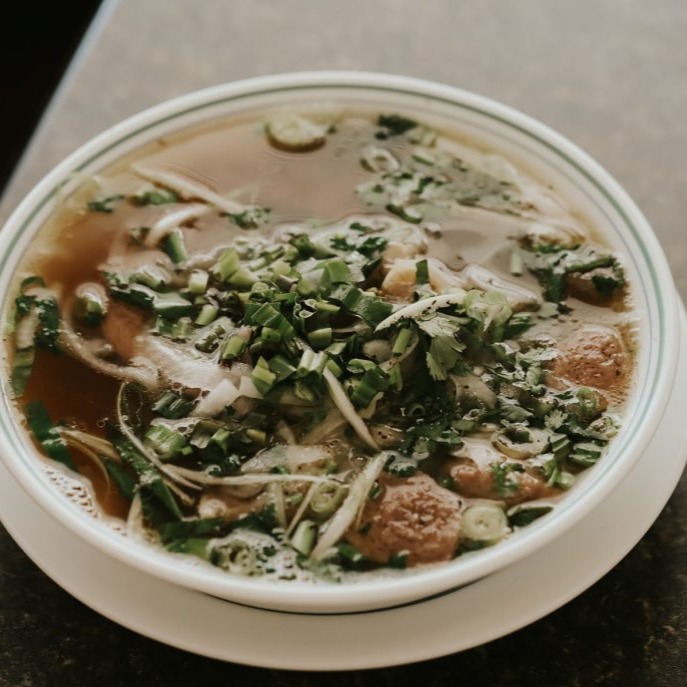 featuring thinly sliced beef,beef tendon,juicy beef balls,all topped with green onions,cilantro,white onion,rice noodle in classic Pho beef broth