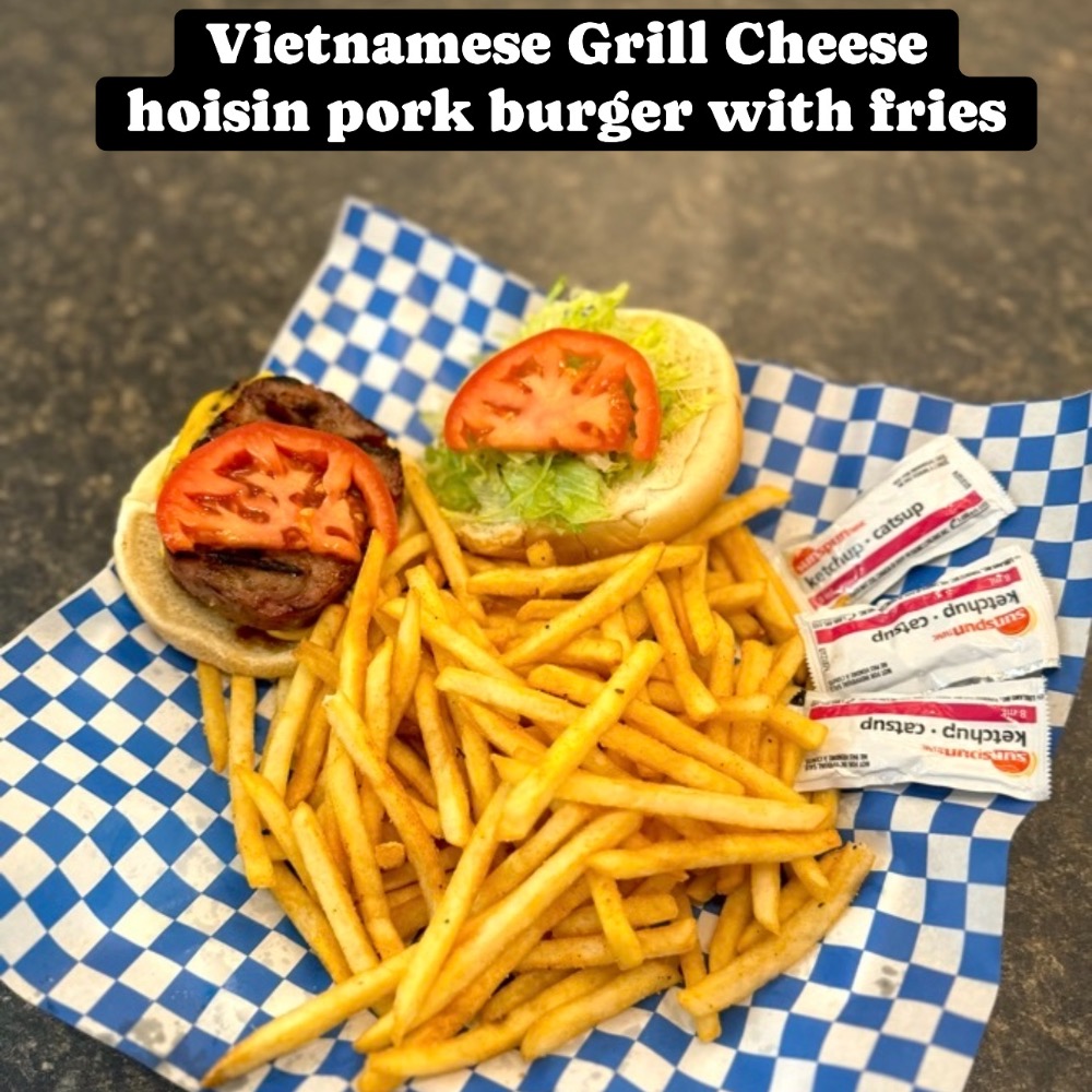 Vietnamese Grill cheese hoisin pork burger with fries