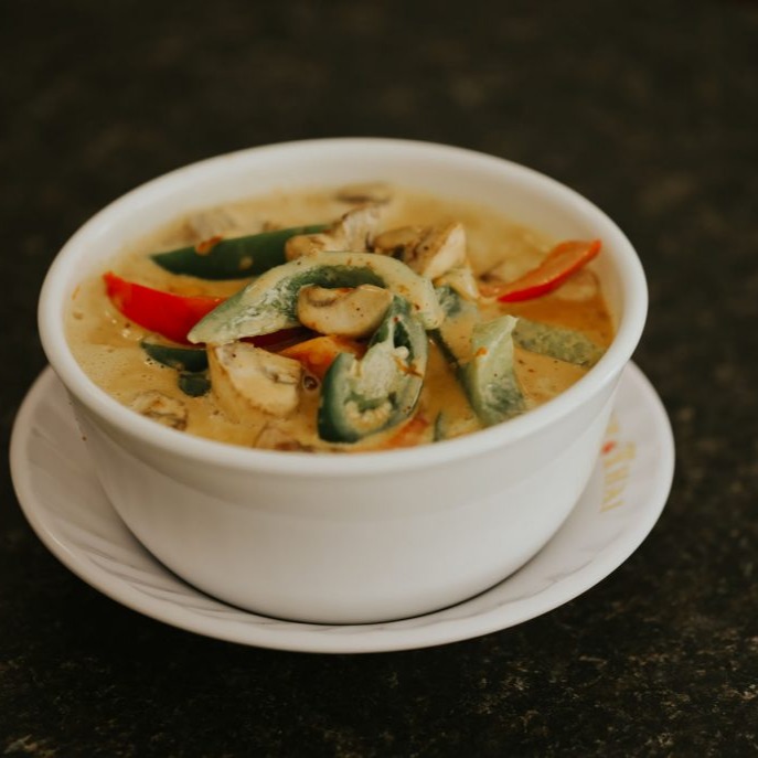 Comes with Red Peppers, sliced Eggplant, Bamboo Shoots in our delicious Coconut Milk Green Curry.